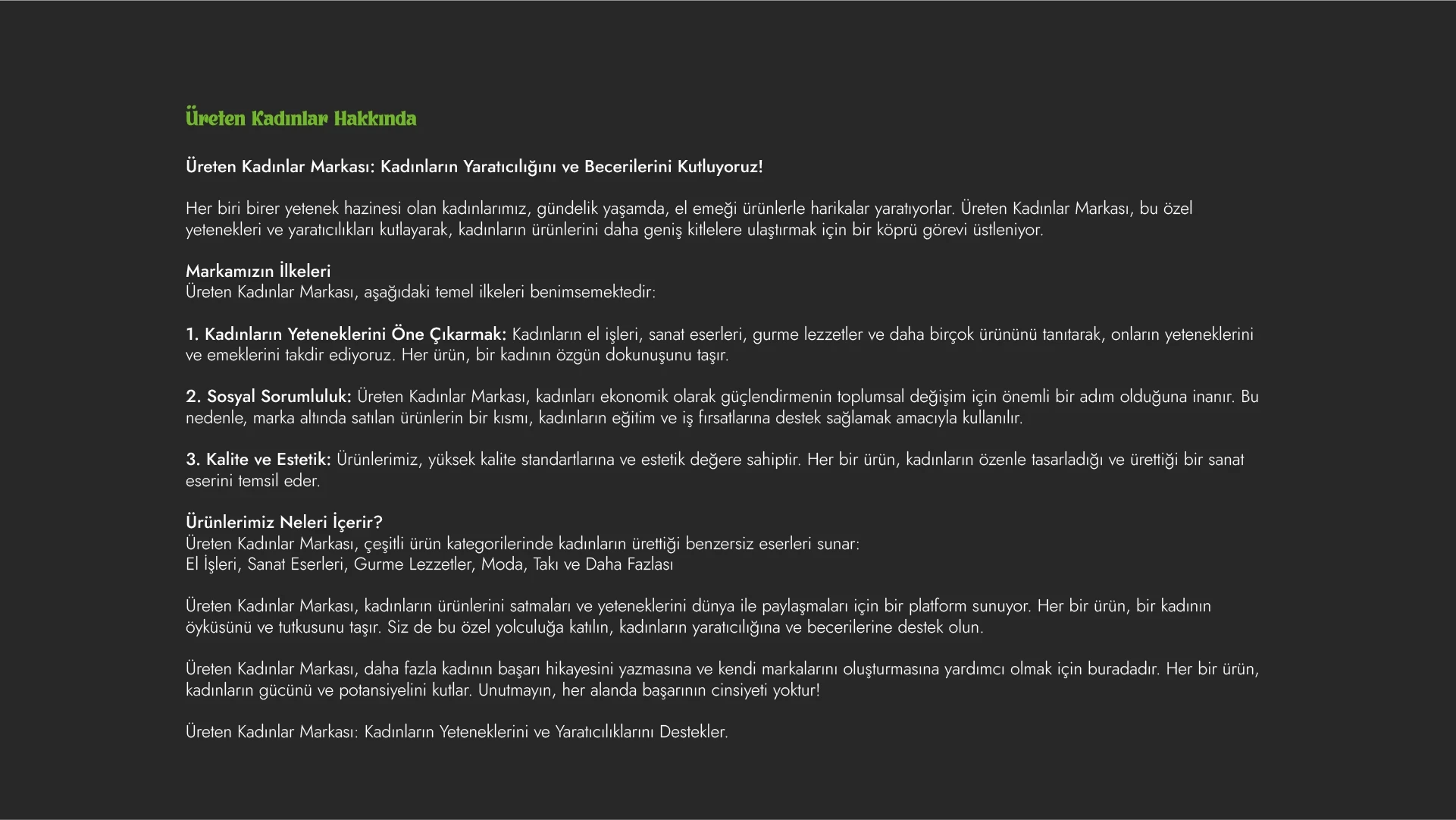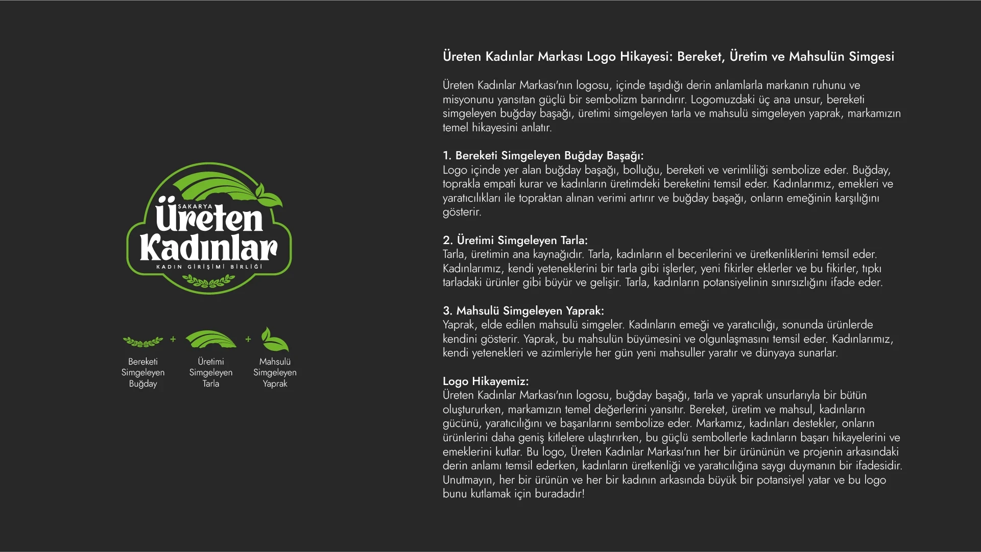 Üreten Kadınlar için geliştirdiğimiz marka sürecinde, genç kadın girişimcilerin el emeğiyle ortaya koyduğu doğal ürünlerin ruhunu ve samimiyetini merkeze alarak kapsamlı bir marka stratejisi oluşturduk. Bu strateji doğrultusunda; kurumsal kimlik tasarımı, logo, renk paleti, ambalaj dili ve iletişim tonunu şekillendirerek markanın sıcak, güven veren ve topluluk odaklı kimliğini güçlendirdik. Süreç boyunca hem üretimin doğallığını hem de girişimci kadınların hikâyesini yansıtan bütüncül bir marka deneyimi tasarlayarak Üreten Kadınlar’ın pazarda daha görünür, akılda kalıcı ve değer odaklı bir marka olarak konumlanmasını sağladık.